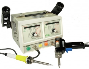 Состоит из основного блока и подключаемых к нему через низковольтные DIN-штекеры электрического паяльника и отсасывающего устройства. Основной блок имеет две независимые электронные схемы автоматической регулировки и поддержания на заданном уровне температуры паяльника и отсасывающего устройства мощностью 50 Вт, что позволяет использовать паяльную станцию для проведения параллельных операций пайки-распай- ки. Рабочие температуры устанавливаются при помощи потенциометров передней панели по показаниям светодиодных индикаторов шкального типа. Внутри основного блока находится также компрессор для создания вакуумно- го разряжения до 500 мм. рт. ст., подсоединяемый через специальный штуцер передней панели к отсасывающему устройству. Для удобства в эксплуатации фильтр отсасывающего устройства выполнен из термостойкого стекла.