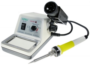 SR-976 Обеспечивает быстрый нагрев (до 1,5 мин), автоматическое поддержание установленной температуры жала паяльника с точностью ±10°С и свето- диодную индикацию выхода на заданный температурный режим. Точный контроль температуры осуществляется посредством сенсора, расположенного в корпусе керамического нагревательного элемента. Жало полностью изолировано от электронной схемы, что гарантирует безопасность работ с компонентами, чувствительными к статическому электричеству. В комплект станции входит основной блок с электронным регулятором температуры в пределах от 250 до 480 °C, держатель паяльника, губка для очистки жала паяльника, электрический паяльник мощностью 50 Вт на рабочее напряжение 220/240 В переменного тока с керамическим нагре- вательным элементом и металлокерамическим жалом. Паяльная станция SR-976ESD имеет схожие технические параметры с базовой моделью SR-976, оснащена дополнительным терминалом для заземления, имеет защиту от разрядов статического электричества и предназначена для пайки сверхчувствительных компонентов. ТЕХНИЧЕСКИЕ ХАРАКТЕРИСТИКИ Напряжение питания: 220 В/50 Гц Потребляемая мощность: 50 Вт Температурный режим пайки: 250..480°С Напряжение питания паяльника: 24 В Сопротивление изоляции: 100 МОм Размеры: 175 х 103 х 90 мм Вес: 870 г