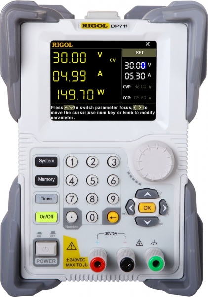 - Индикация Rigol DP711: ЖК-дисплей, 3.5 дюйма, отображение информации о напряжении, токе, мощности