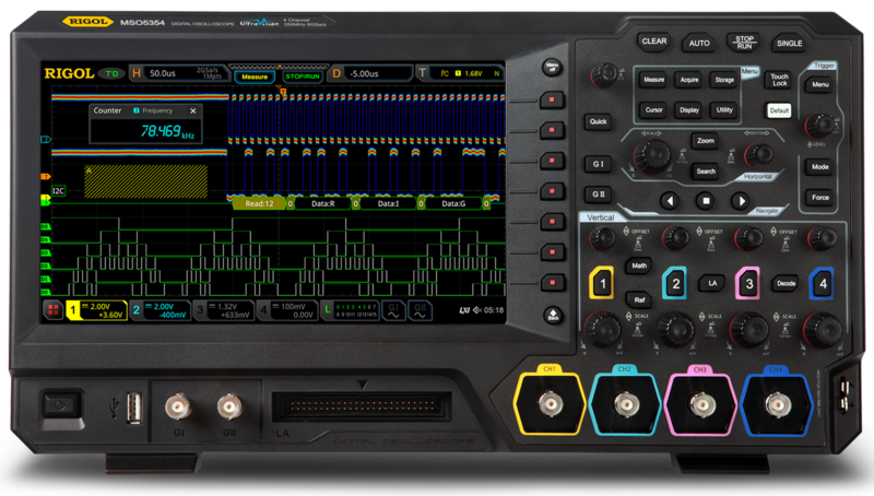 - Дисплей Rigol MSO5074: цветной, сенсорный ЖК, диагональ 23 см, 1024×600